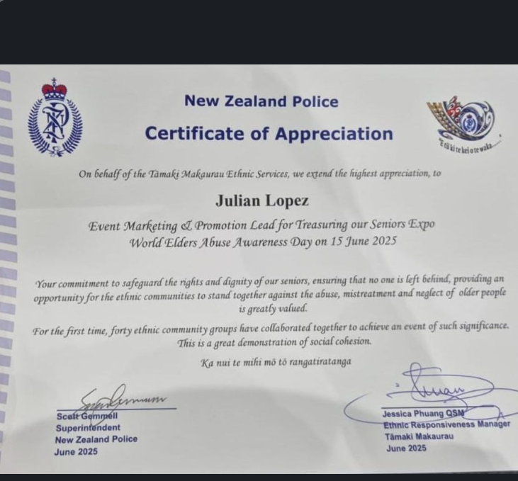Our Financial Manager, Julian Lopez, was presented with a Certificate of Appreciation by the New Zealand Police for his outstanding support and contribution