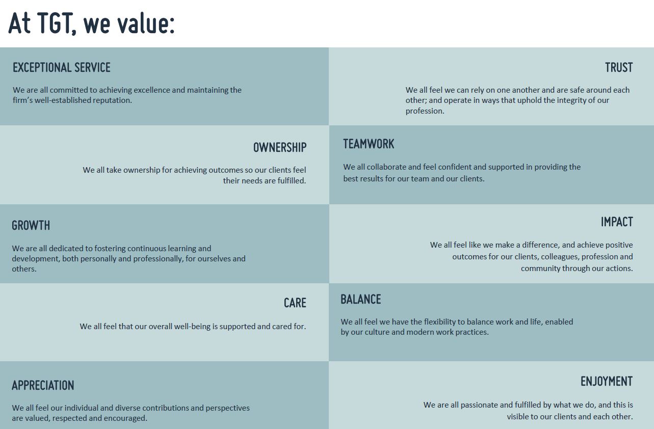 The partners and staff of TGT have recently undertaken the exercise of reviewing our collective corporate values.